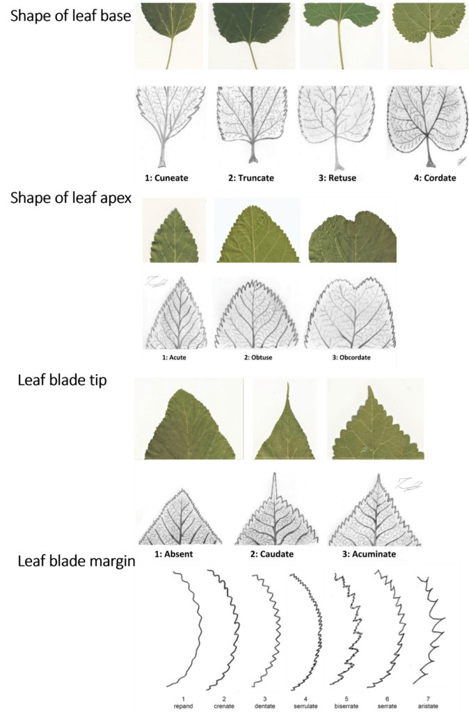 Figure 3: Morphological characterization of the leaves. Shape of leaf base, shape of leaf apex, leaf blade tip, leaf blade margin.