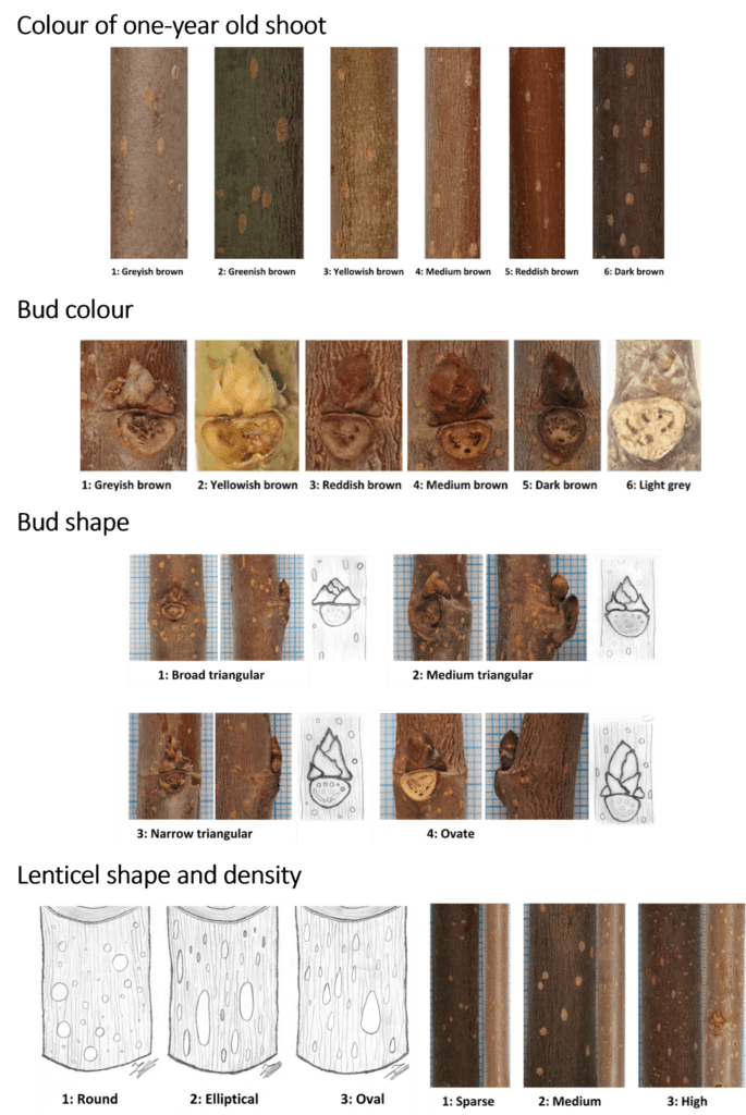 Figure 1: Morphological characterization of the one-year old shoots and buds. A) Colour of the one year old shoot, B) Bud colour, C) bud shape, D) Lenticel shape.