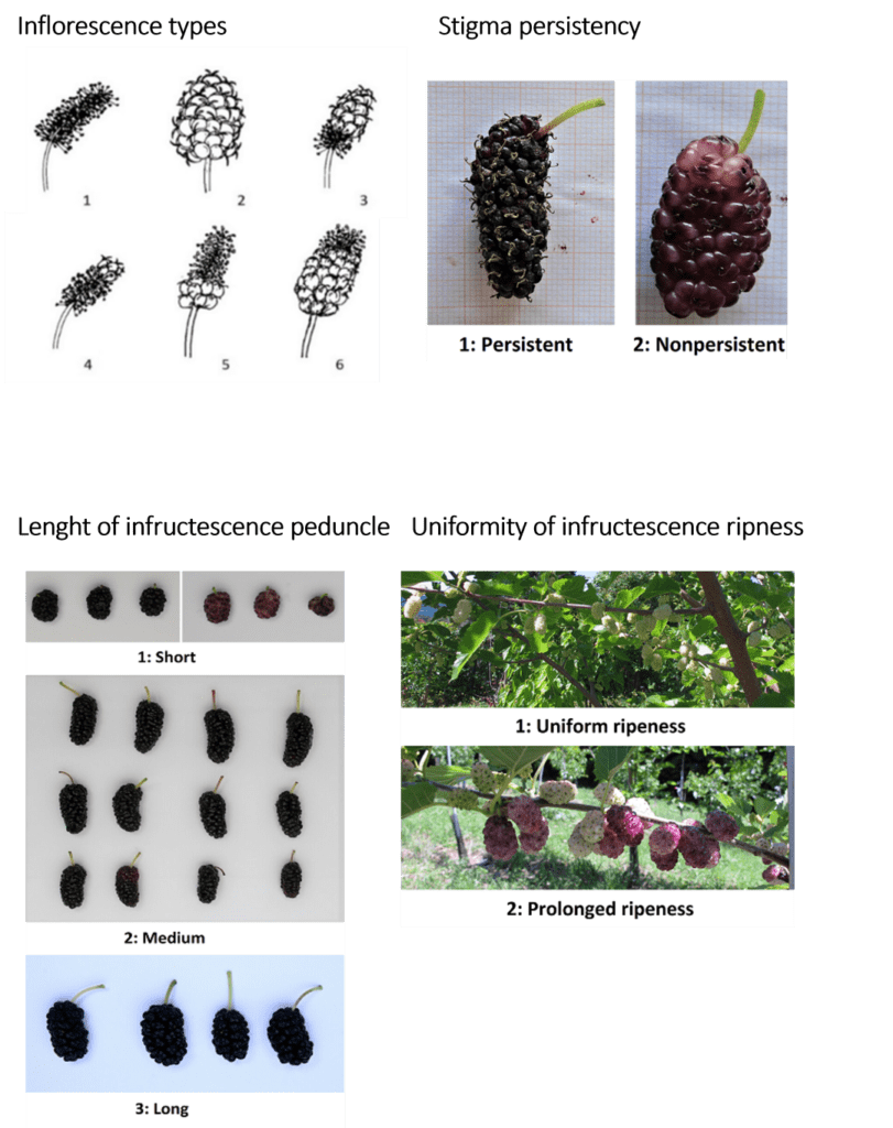 Figure 4: Morphological characterization of the reproductive structures. Inflorescence types, stigma persistency length of infructescence peduncle, uniformity of infructescence ripness.